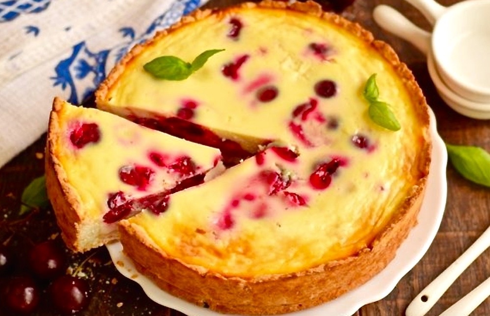 Достаньте форму с тестом из холодильника. Выложите на корж подготовленные ягоды. Залейте все приготовленной сметанной смесью. Если ягоды «разбежались», аккуратно верните их на место ложкой.