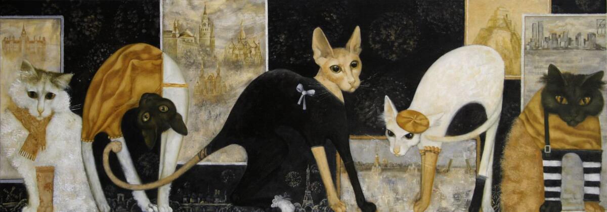 А само удивительное сочетание города и его хранителей позволяет создать художнице очень своеобразный мир, существующий и живущий по своим законам. И хотя художнице приписывают сюрреализм, на мой взгляд, более уместно говорить о постмодерне с элементами магического реализма.