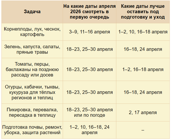 А вот здесь убывающая Луна выходит на первый план. Если вы любите традиционный принцип «корешки – на убывающую», то апрель 2026 даёт очень понятные окна: 3–9 и 11–16 апреля. Для юга и Поволжья это прямо рабочий период. Для средней полосы – в первую очередь для редиса и моркови, а свёклу часто разумнее смещать к концу апреля или маю, смотря по погоде. Для Урала, Сибири и Дальнего Востока открытый грунт по корнеплодам в апреле чаще ещё рано, но можно готовить гряды, прогревать почву под укрытием и не делать из календаря повод для отчаянных поступков.