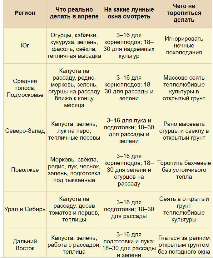 Если вы на Урале или в Сибири, то любой универсальный календарь, который предлагает в апреле массово сеять кабачки в открытый грунт, можно использовать разве что как подставку под стакан с рассадой. По региональным рекомендациям для Урала и Сибири в апреле обычно сеют капусту на рассаду, а морковь, свёклу, редис и картофель чаще выходят в грунт уже в мае. Огурцы и кабачки под укрытие – нередко только в июне.