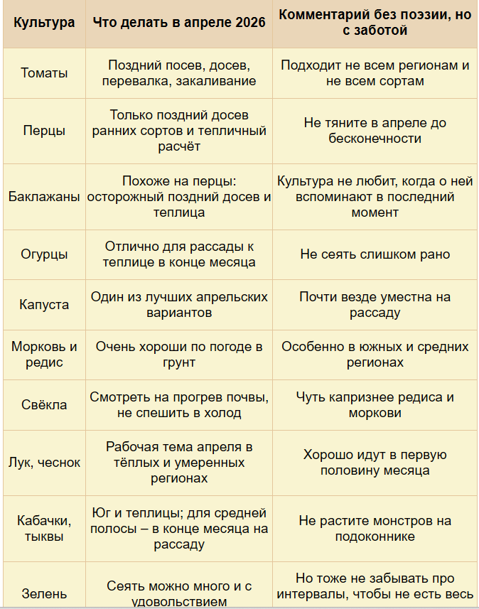 Будет подробно, с юмором, по-человечески и с таблицами. Потому что апрель – это месяц, когда у огородника одновременно дрожат руки от энтузиазма и от мысли: «Я не успею всё посеять, перевалить, укрыть, пролить, распикировать и при этом не поссориться с погодой». Спокойно. Сейчас всё разложим.