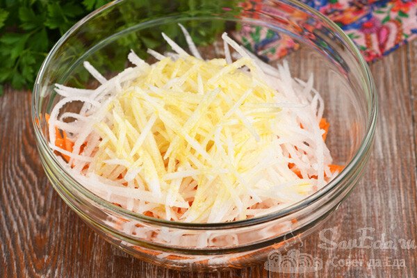 Редьку (200 г, у меня дайкон) очищаем и, как морковь, измельчаем на терке. Овощи рукой не мнем, чтобы не выделилось много жидкости. Солим, добавляем растительное масло (2 ст. л., у меня оливковое) и сок лимона (1 ч. л.).