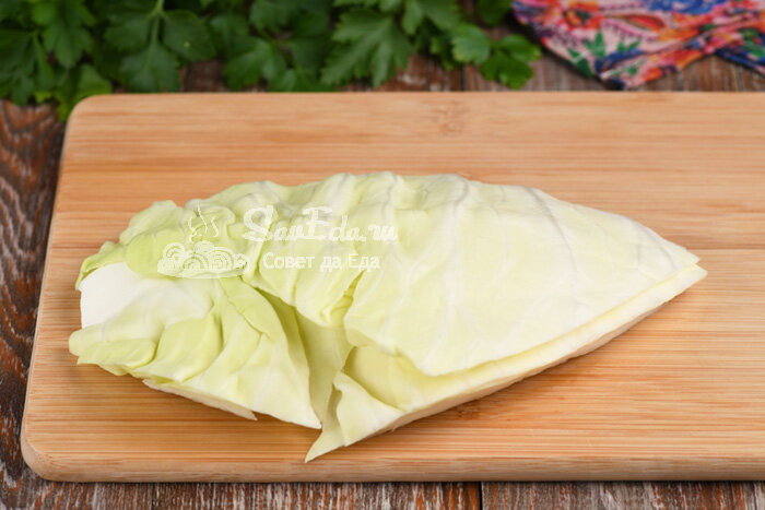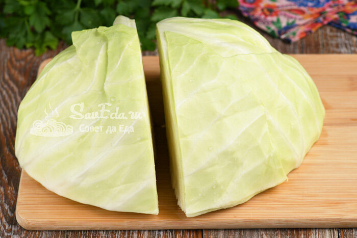 Делим кусок капусты по листьям на 4-5 частей. Они очень легко разделяются.