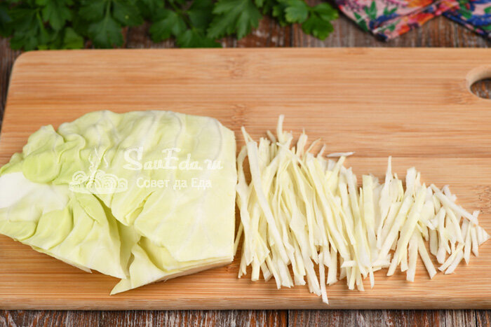 Салат из капусты больше никогда не будет скучным. Капусту (300 г) нарезаем соломкой.