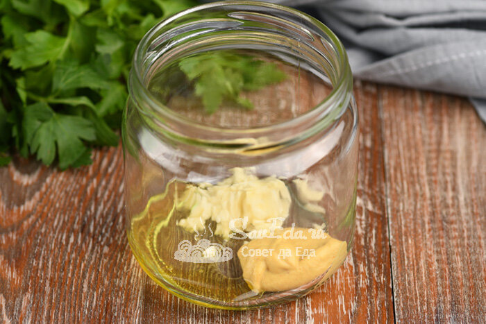 Заправку готовлю в небольшой банке (можно сделать сразу несколько порций, хранить в холодильнике и готовить с ней салаты каждый день). Храню 3 дня. В банку на одну порцию выкладываем мед (1 ч. л., можно заменить на сахар), острую горчицу (1 ч. л.) и измельченный через пресс зубчик чеснока.