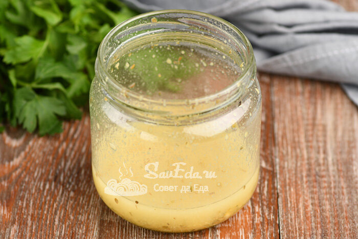 Банку закрываем крышкой, трясем и заправка готова. У нее яркий вкус.