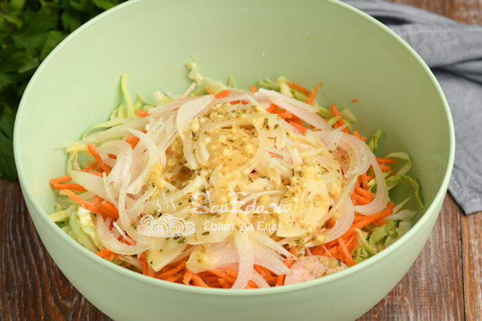 Морковь (1 шт.) натираем соломкой, репчатый лук (1 шт.) нарезаем перьями. Все выкладываем в миску с капустой и солим. Добавляем заправку.