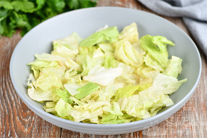 Здесь заправка и еще один продукт, который дает отличный вкус. На дно большой тарелки выкладываем листья салата (100 г). У меня айсберг, мне нравится легкий приятный хруст.