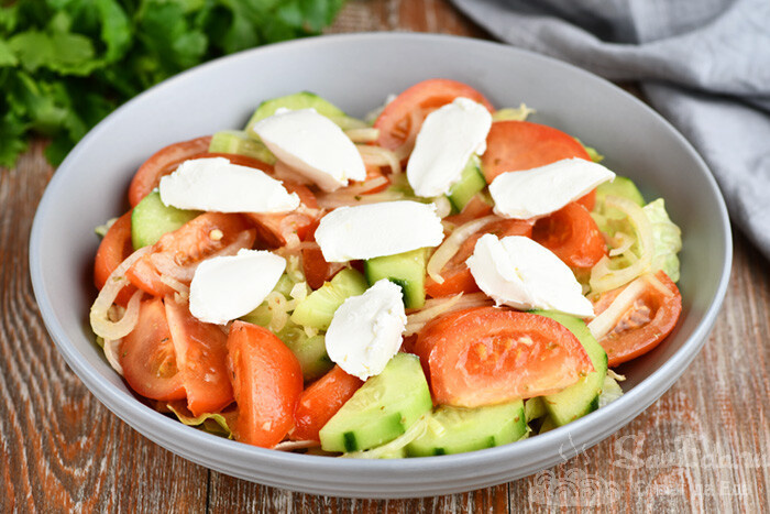 На листья салата размещаем заправленные овощи (на дне миски еще останется часть заправки). Добавляем сверху творожный сыр (50 г). С помощью двух чайных ложек придаем сыру форму и размещаем на овощах.