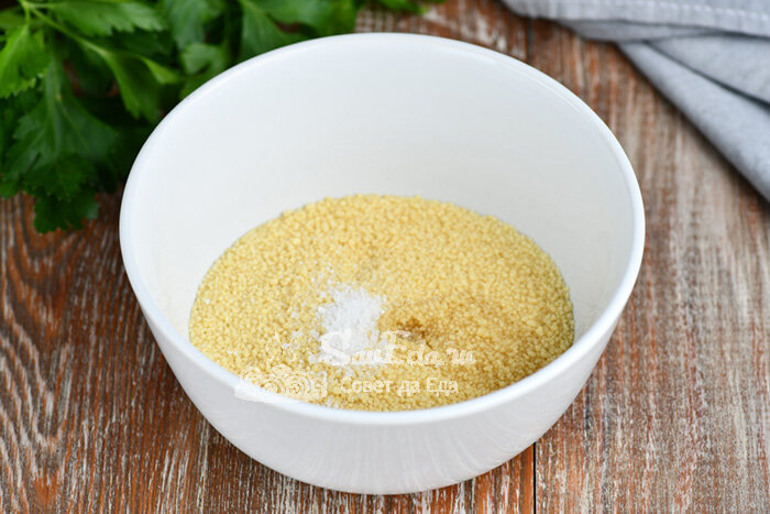 В кускус (5 ст. л.) добавляем соль (1 небольшая щепотка) и растительное масло без запаха (1 ч. л.).