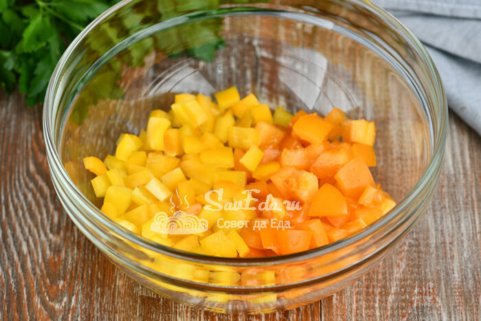В салатник выкладываем нарезанные на кубики помидоры (2 шт. среднего размера) и сладкий перец (1/2 шт.). Можно добавить свежий огурец, стебель сельдерея, редьку и редис (любые сочные овощи).