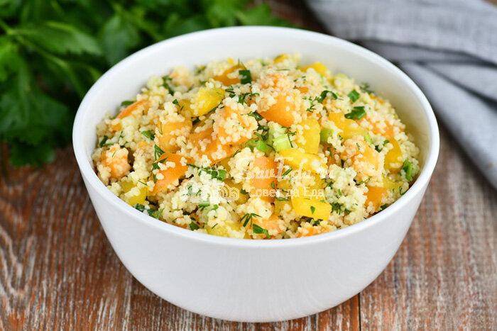 За счет овощей салат получается сочным, зелень его освежает, а кускус дает интересный приятный вкус. Получается красивый, вкусный салат, гарнир или полноценное блюдо.