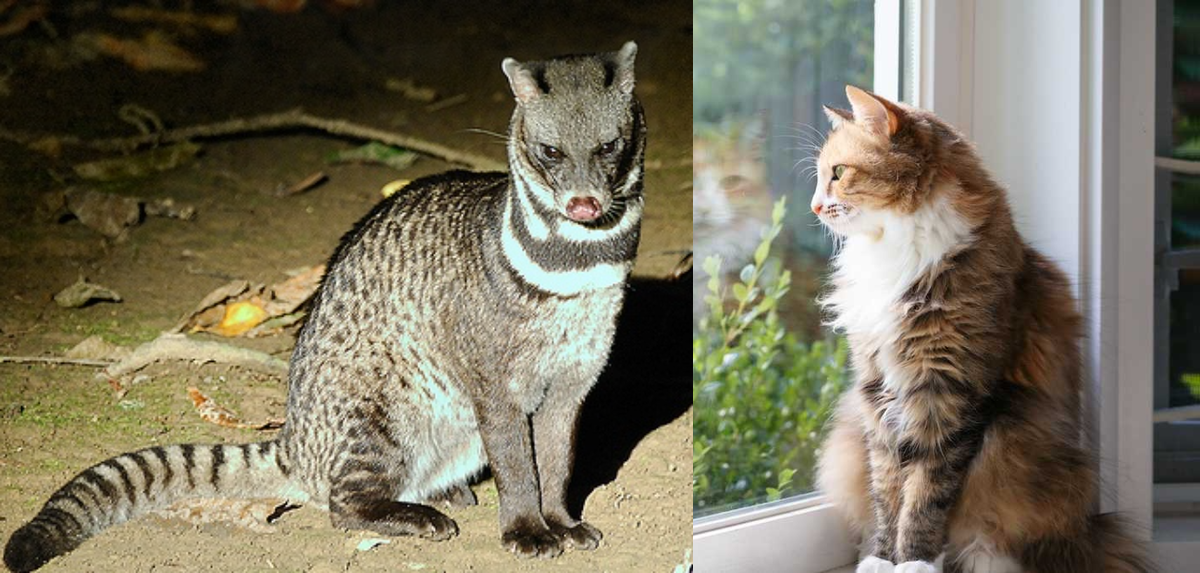 Циветты — это дальняя родня гиен и кошек, вместе с ними входящая в подотряд кошкообразных. Поэтому в них и правда есть что-то кошачье: это очень гибкие и ловкие животные с отличным нюхом и длинным крепким хвостом, который резко бьёт из стороны в сторону, когда тангалунга злится.