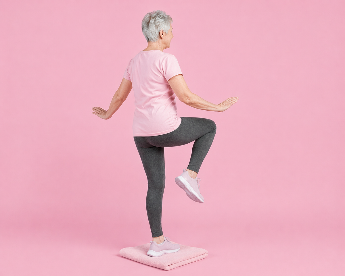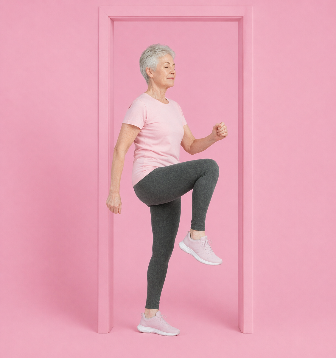 Пока вы тянетесь ногой в сторону, опорная нога вынуждена балансировать при смещённом центре тяжести — именно это и тренирует. Не статическое равновесие, а динамическое. То самое, которое нужно, когда вы тянетесь за чем-то на полке или поднимаете внука.
