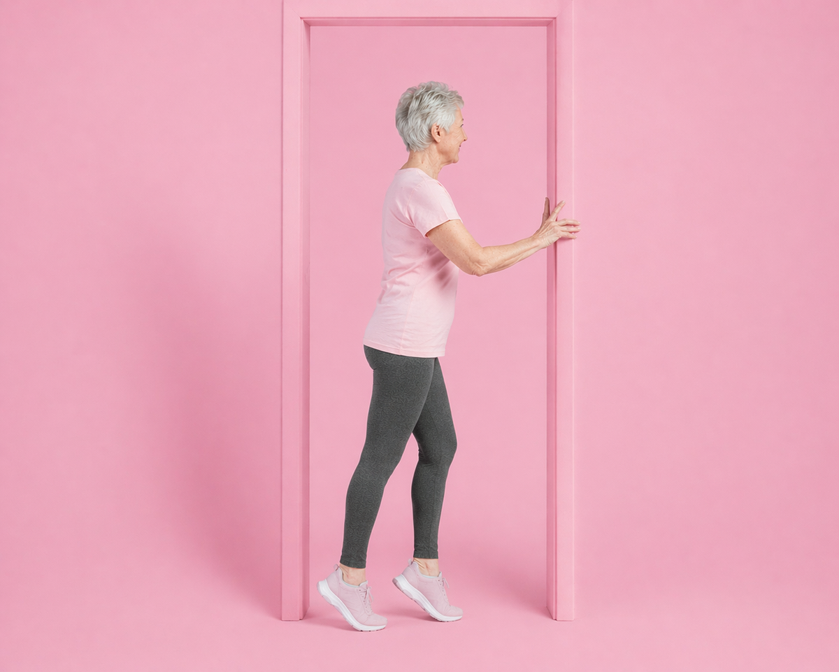 Встаньте в дверном проёме, слегка касаясь косяков по бокам пальцами — не опираясь, только страхуясь. Медленно перенесите вес на пятки, подняв носки. Замрите на две секунды. Затем плавно перекатитесь на носки, подняв пятки. Снова замрите. И обратно.