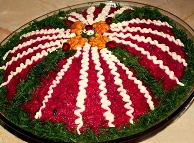 Ингредиенты: -4 вареных свеклы -2 вареных морковки -1 горсть чернослива -150 г твердого сыра -400 г куриного мяса -3 зубчика чеснока -2/3 ст. грецких орехов -пучок свежего укропа -майонез