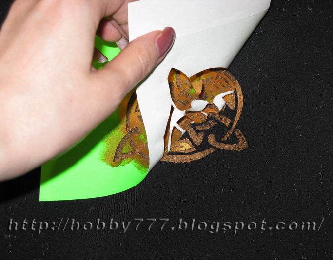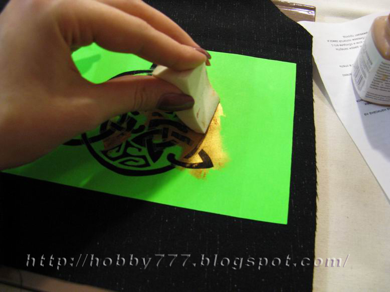 [показать]Снимаем защиту с клеевой стороны и клеем на ткань, на место расположения рисунка. Прижимайте хорошо, чтобы в последствии краска не затекла за края.
