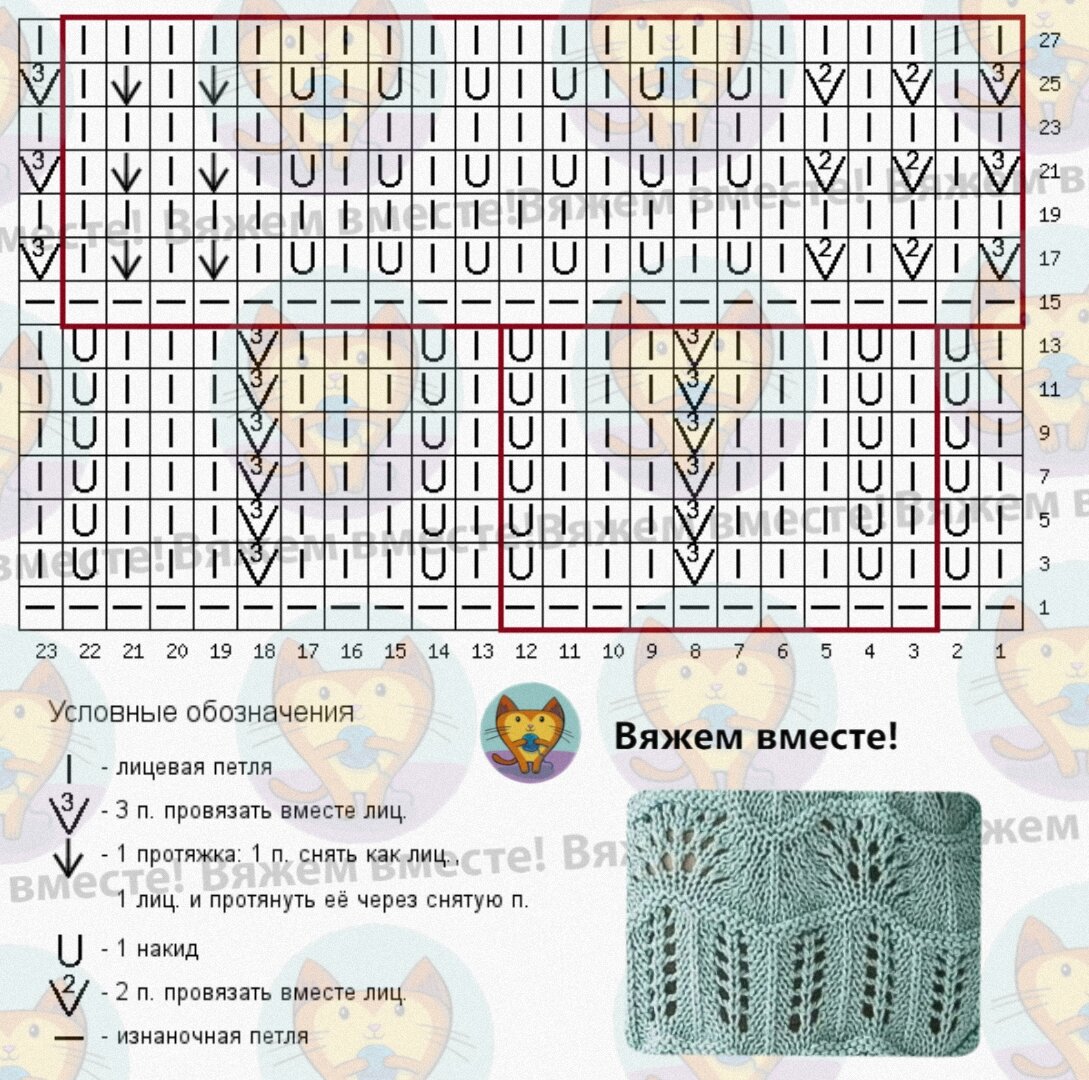 Раппорт дорожек равен 10 петлям по ширине и 14 рядам по высоте, а раппорт узора "павлиний хвост" составляет 22 петли по ширине полотна и 8 рядов по высоте. Петли каждого раппорта обозначены красной рамкой.