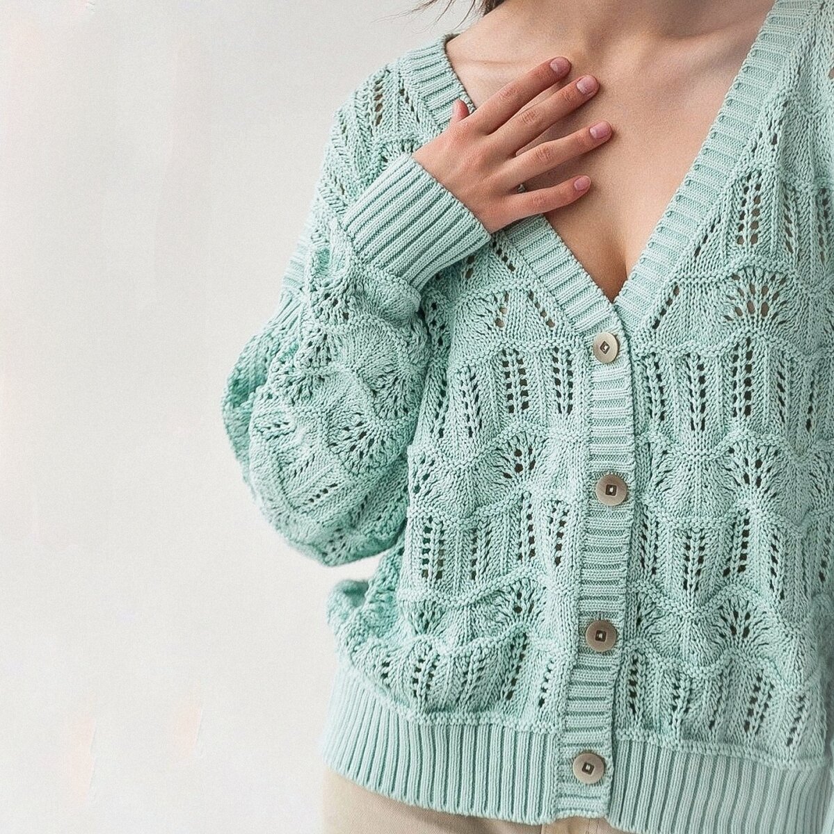 В полотне чередуются элементы узора павлиний хвост и элементарные ажурные дорожки с убавлениями по три петли вместе. Нижний край, планка и манжеты выполняются резинкой два на два.