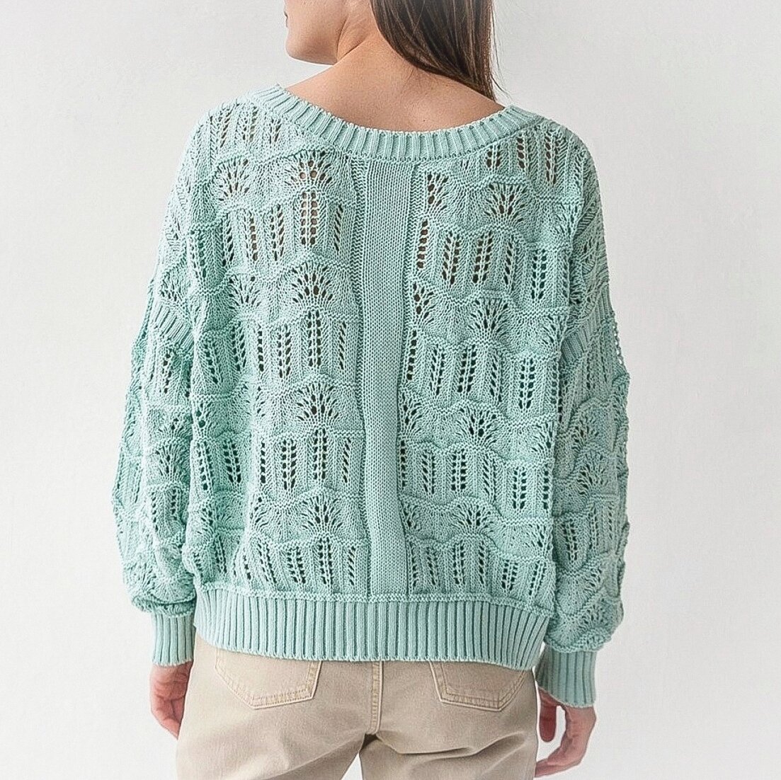 А от центра низа спинки и до выреза горловины тянется вверх широкая дорожка из 9 лицевых петель. По сторонам от неё вяжутся по две изнаночные петли. Такие детали смотрятся свежо и необычно.