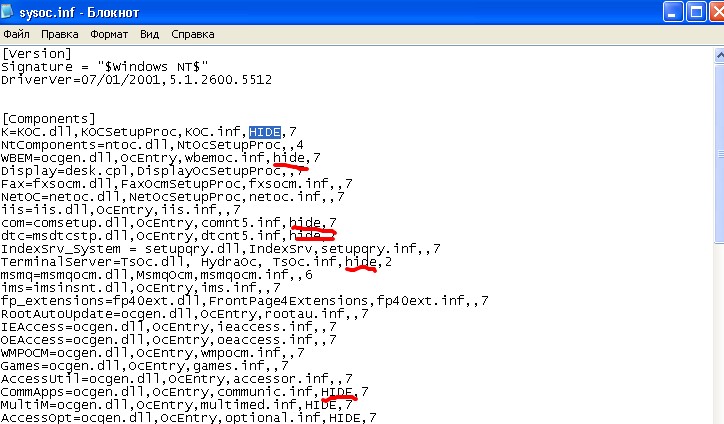 Перед тем как вносить изменения в файл Sysoc.inf, обязательно сделайте его резервную копию!