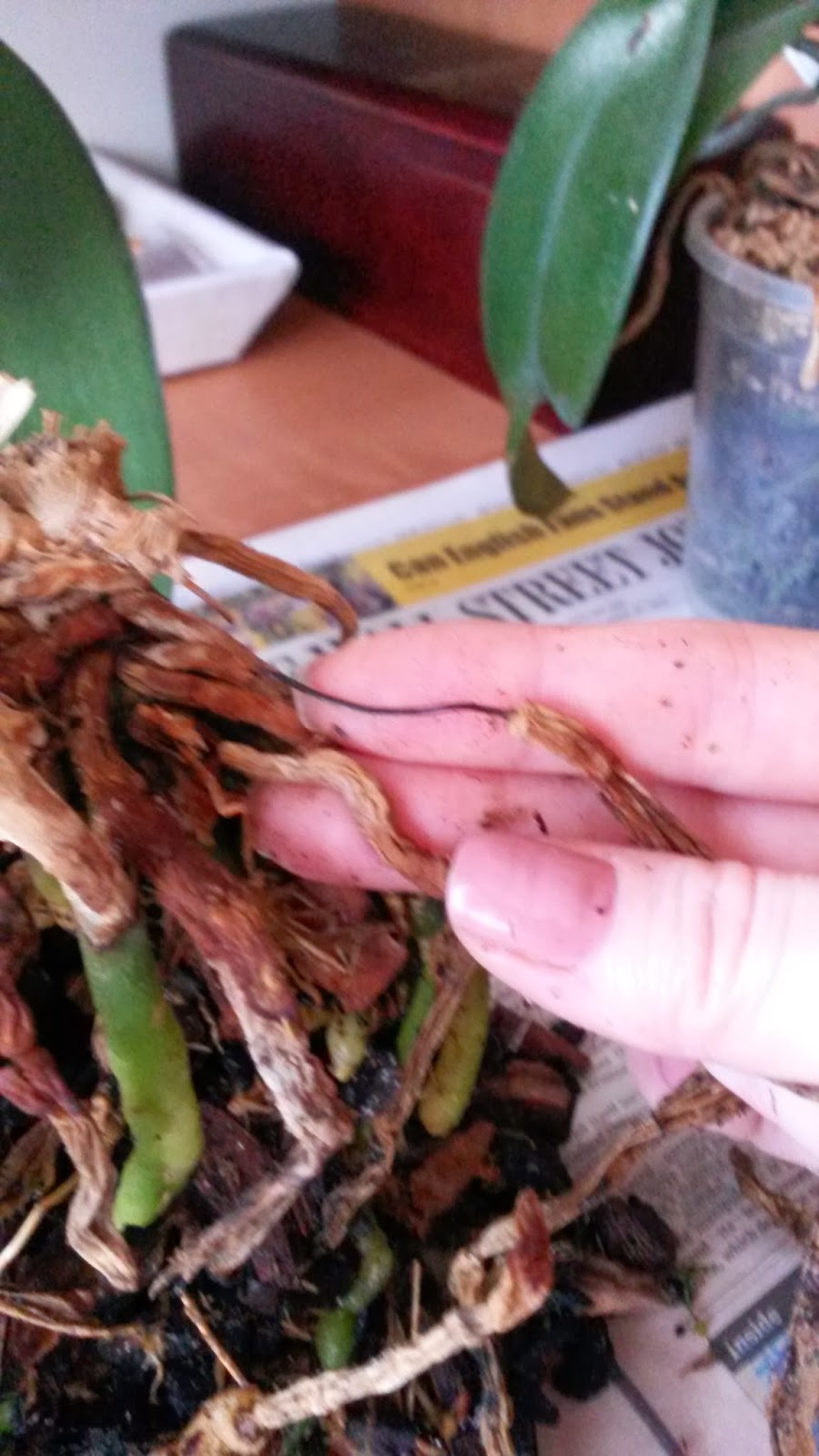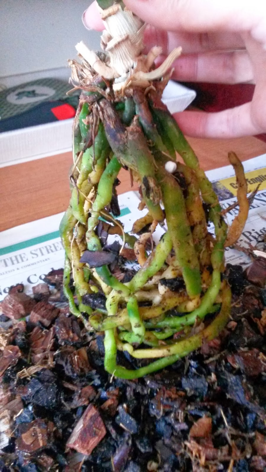 Вот наша почищенная корневая система. Корни хорошие, здоровые, шансы на цветение замечательные.