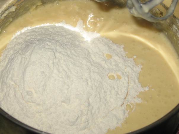 Потом сметану и разрыхлитель, муку. Всё тщательно перемешиваем.