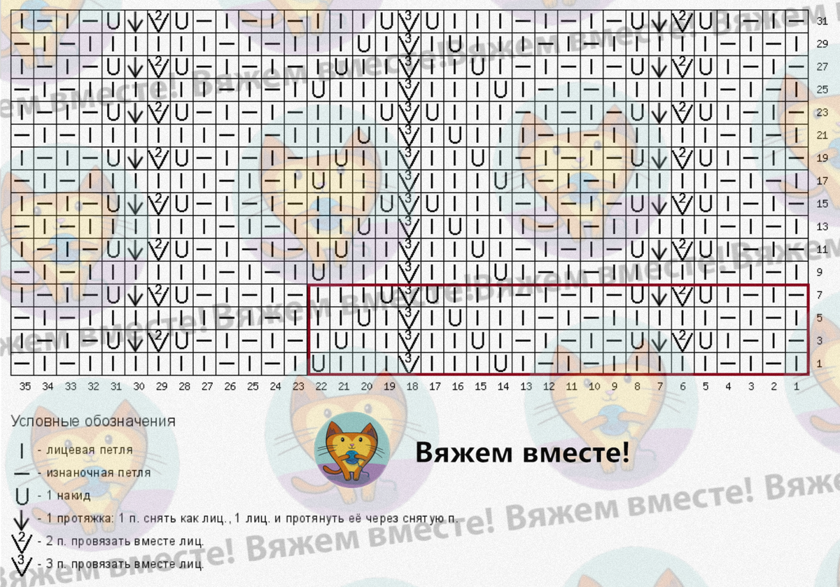 Раппорт узора равен 22 петлям по ширине и 8 рядам по высоте, выделен красной рамкой.