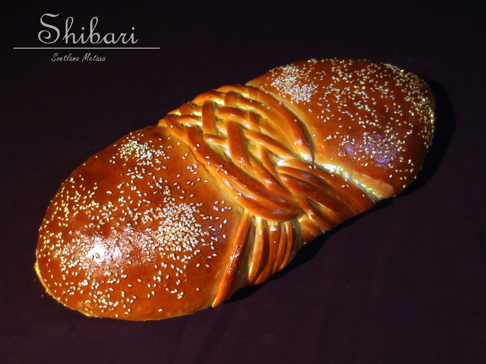 9.Смазываем хлеб взбитым желтком, смешанным с молоком, накрываем, оставляем на время, пока хлеб не удвоится в размере. Перед выпечкой посыпаем кунжутом. 10.Разогреваем духовку до 180 градусов. Выпекаем хлеб 40-45 минут. Вынимаем из духовки и даем остыть.