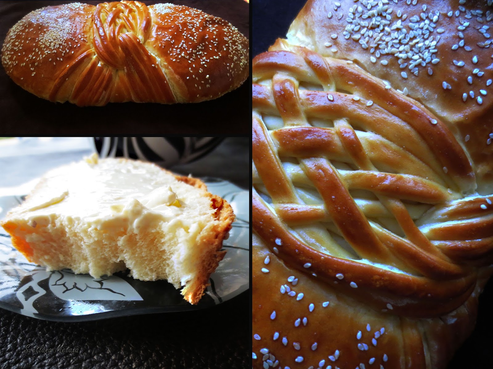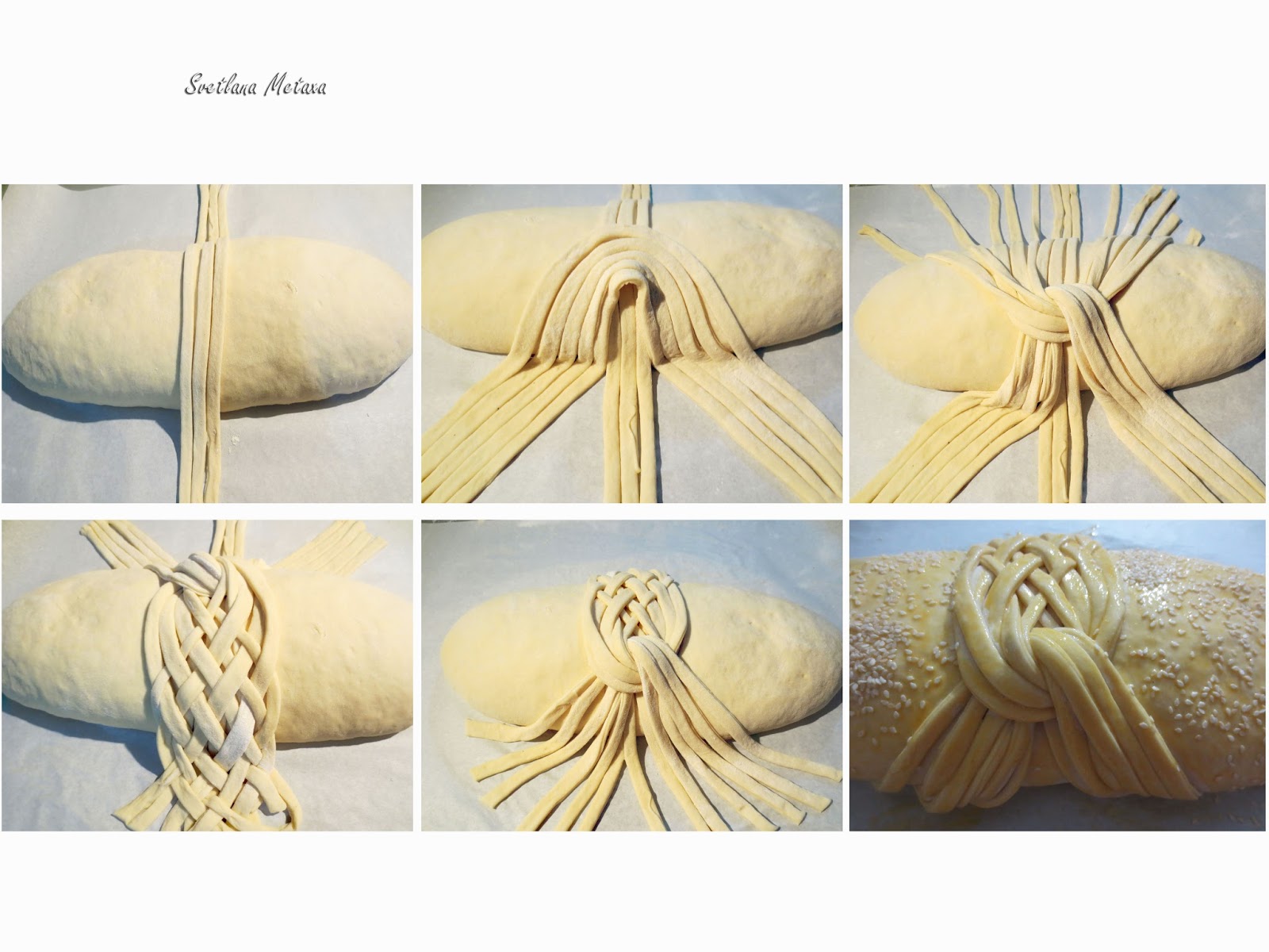 1.В миску просеять муку , добавить молоко, апельсиновую воду, ваниль, яйцо и дрожжи.Хорошо перемешать до однородной массы. 2.Затем добавить мед и соль и замесить до гомогенизации. 3.Рабочую поверхность присыпать мукой и положить тесто. Месим до получения гладкой массы. Добавляем масло и вновь месим тесто 15-20 минут. 4.Накрываем тесто пленкой и оставляем отдыхать примерно на 2-2/5 часа. 5.Выкладываем тесто на рабочую поверхность, обминаем его. Делим на 2 неравные части. На батон идет примерно в 3 раза больше теста, чем на оформление. 6.Из большой части теста формируем батон. 7.Из другой части теста раскатываем пласт, толщиной 5 мм, разрезаем его на параллельные полосы, шириной 6 мм. 8.Оформляем батон ( см фото)
