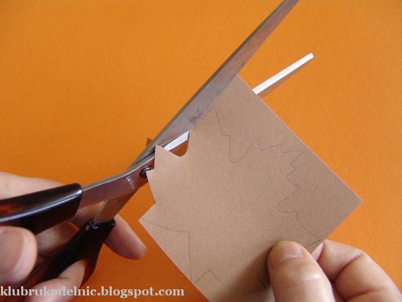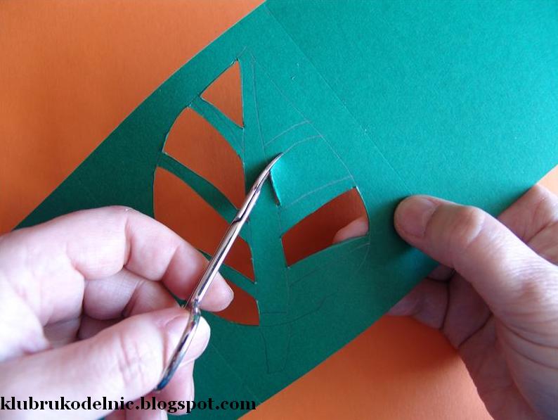 4. Другой фонарик сделаем из листа твёрдого картона размером 12х41 см. Полосу разделим карандашом на четыре прямоугольника размером 12х10 см, один см на конце послужит как шов для склеивания подсвечника. На один прямоугольник нарисуем лист (по шаблону живого листа). Вырежем его так как видите на фото - получится скелет листа, состоящий из жилок.