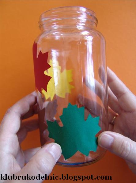 1. Для изготовления простых фонариков понадобятся обыкновенные стеклянные банки разных форм и размеров, которые нужно хорошо вымыть и высушить. На цветную бумагу по шаблону или с помощью настоящего листа дерева нарисуем форму листа двух размеров.