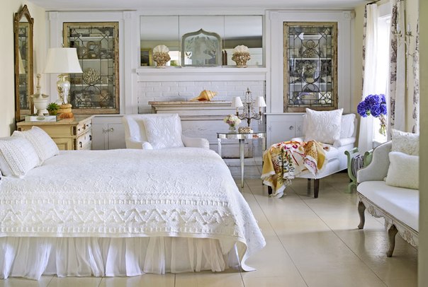 Зеркальное оформление потолка или стен, живые цветы ( например, букет из полевых цветов или долгоцветущие орхидеи), немного картин и сувениров помогут внести шарм в ваш романтический интерьер спальни.