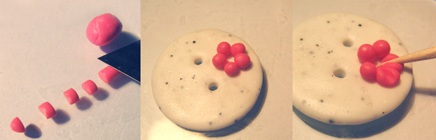 [320x102]Из глины красного цвета скатайте колбаску и нарежьте пять одинаковых частей. Пальцами скатайте шарики и разложите их по кругу на основе. При помощи зубочистки расплющите лепестки цветка, как показано на фото.