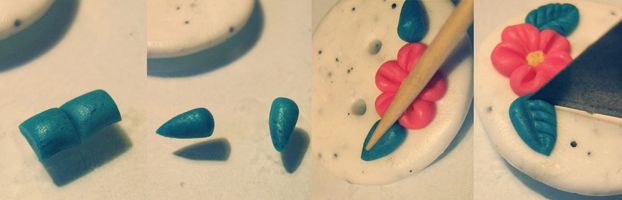 [320x102]Для листиков нам понадобится глина зеленого цвета. Из двух одинаковых кусочков глины сформируйте капельки. Разложите их возле цветка и зубочисткой придавите к основе. Лезвием сделайте прожилки.