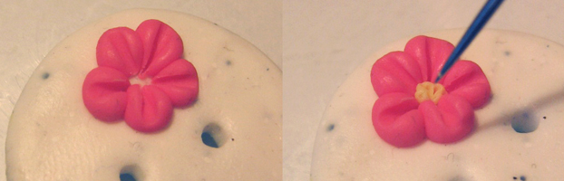 [320x102]У вас должна выйти пяти лепестковый цветок. А теперь ему нужно сделать серединку. Для этого возьмите немного желтой глины и, при помощи иглы, короткими резкими движениями сформируйте серединку.