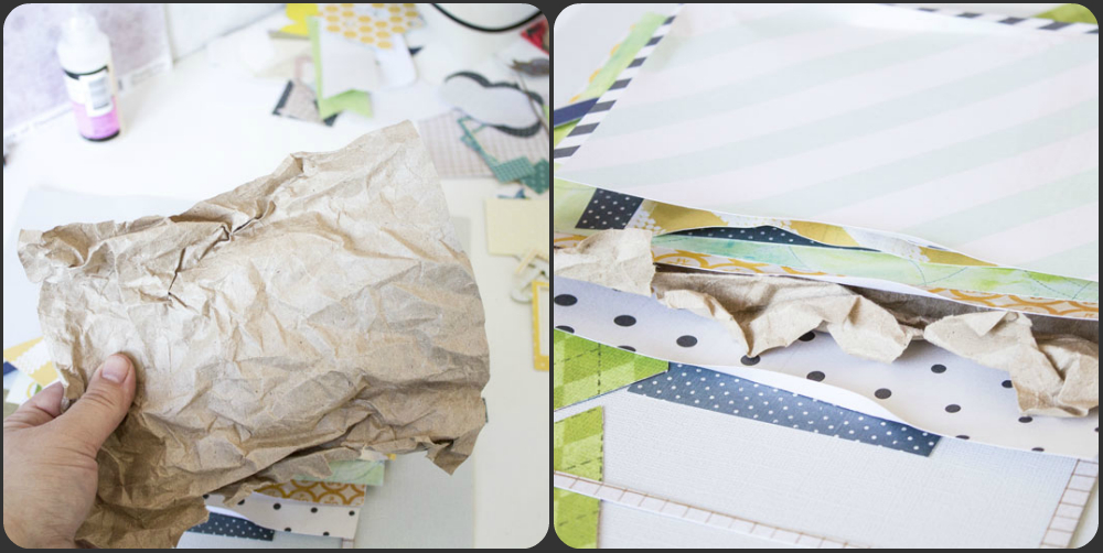 Кроме того, что бумагу можно немного примять, расправить и приклеить, ее еще можно примять и, практически не расправляя, приклеить - получатся вот такие красивые заломы: