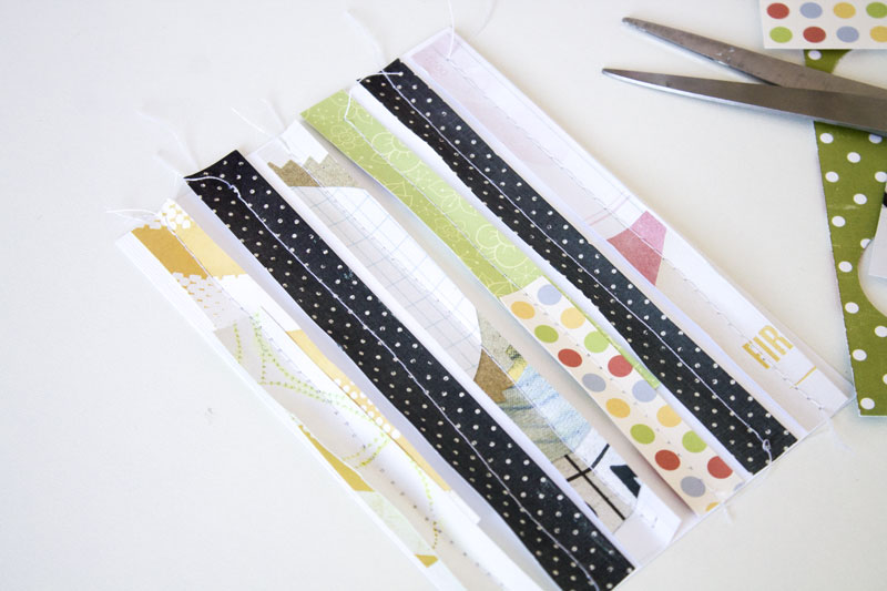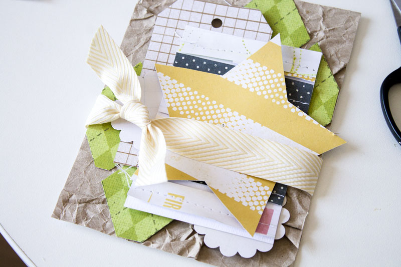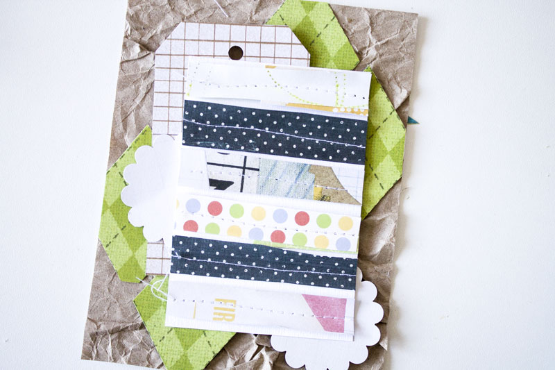 А потом тег, те самые полоски-обрезки, пристроченные к белому кардстоку и пара ажурных кругов: