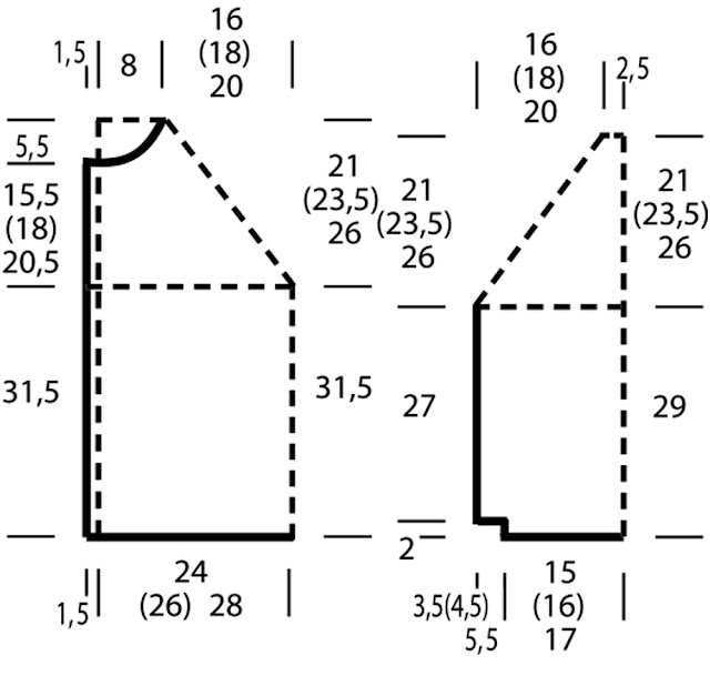 Спинку и полочки до начала кокетки вязать единым полотном. Рукава вязать отдельно. Затем на всех деталях единым полотном вязать кокетку. По техническим причинам рукава на выкройке изображены отдельно.