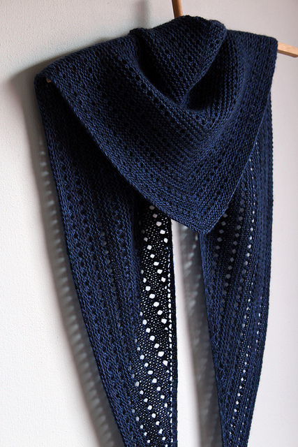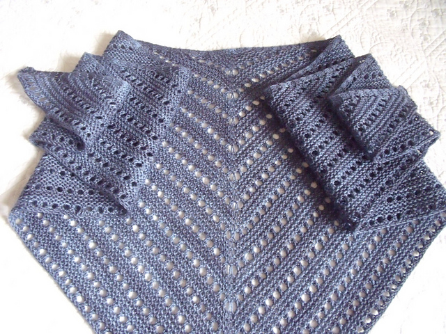 Полосатая текстура платка достигается за счет чередующихся полос платочной вязки и рядов с накидами. Пряжа: Для вязания платка могут использоваться различные по весу и метражу виды пряжи. Образец синего цвета связан из пряжи Malabrigo Yarn Lace (цвета Paris Night и Indigo) в две нити. 50 г по 1 мотку каждого цвета.