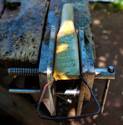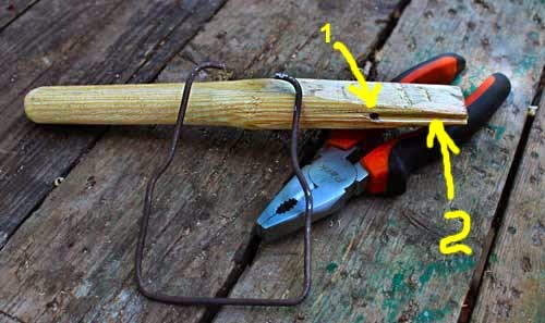 Из дерева изготавливаем ручку. В ней сверлим 2 глухих или 1 сквозное отверстие (1) под диаметр проволоки. От него ножом прорезаем канавку (2) глубиной 2-3 мм.