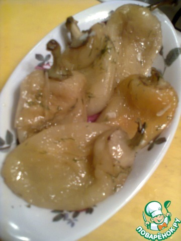 Если желаете законсервировать его, то уложите плотно в чистую баночку перчики, залейте маринадом, накройте крышками, поставьте стерилизоваться в кипящей воде (вода должна быть налита в емкости банкам "по Марусин поясок", накройте крышкой емкость, в которой стоят баночки и стерилизуйте банки 0,5 л. - 15 минут, 1 л. -20 минут. После этого банку закупорьте и переверните донышком вверх. Накройте махровым полотенцем или одеялом и оставьте до полного остывания. Если Вы не хотите стерилизовать таким горячим способом, то можно банки и крышки простерилизовать отдельно, довести перцы в маринаде по кипения, горячими разложить по банкам и тут же закупорить. Дальше как было описано выше. Выход - 3 банки по 0,5 л. + на пробу 3 штучки. Перчики укладываются очень плотно. Они ведь маленькие) Приятного аппетита! |