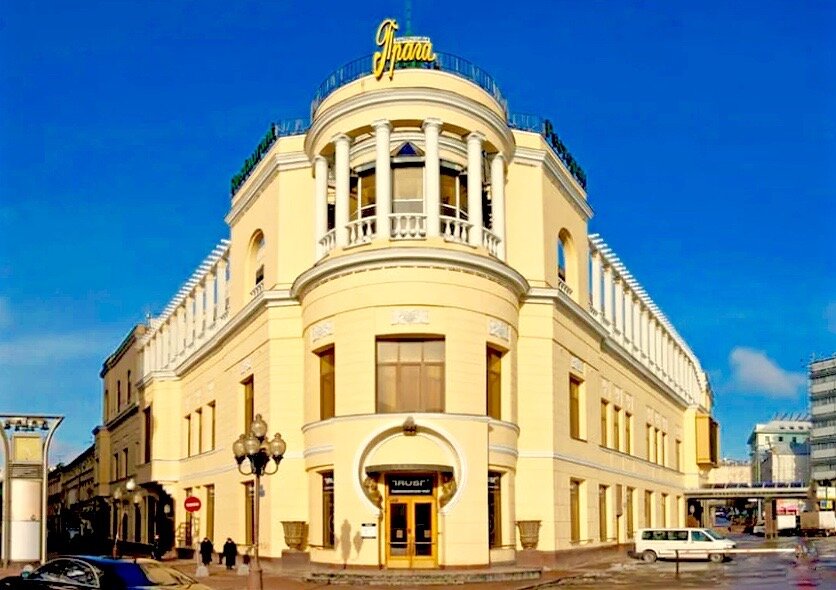 С 1954 по 1955 годы в здании шла реконструкция и перестройка. По проекту Б.И. Соболевского дополнительно надстроили два этажа. В итоге "Прага" получила семь залов: Чешский, Купольный, Бирюзовый, Белый, Ореховый, Новопражский и Музыкальный.