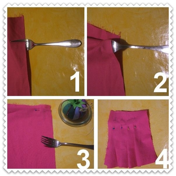 3. Придерживая левой рукой складу, правой вытаскиваем вилку из ткани. Расправляем полученную складу и фиксируем ее портновской булавкой.