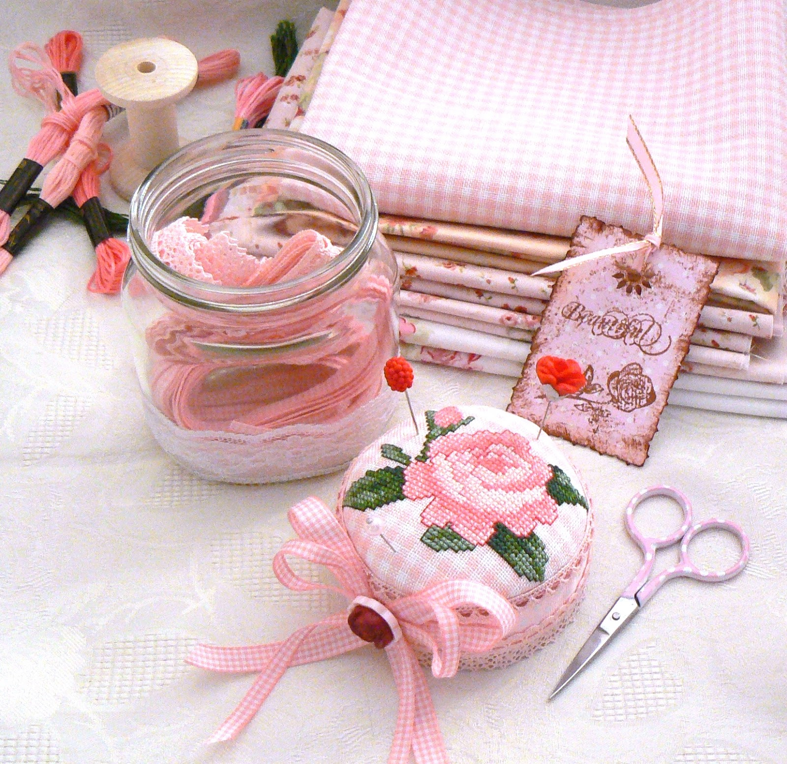 В баночке сложены кружавчики-ленточки для последующих этапов проекта"элегантность".