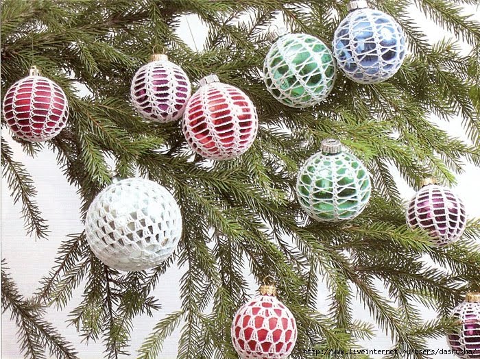 Мастерицам, которые умеют вязать крючком, не составит труда ажурно обвязать шарик. Особенно эффектно смотрятся однотонные шары, обвязанные нитью, которая содержит в своем составе люрекс. Работать со стеклянной игрушкой в этой технике сложно. Она может разбиться прямо в ваших руках. На помощь приходят шары из пенопласта или пластмассы. Узор можно придумать самой или вязать по уже готовой схеме.