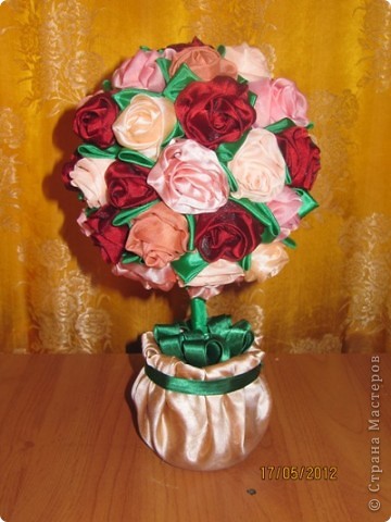 Декорировать дерево можно в технике лоскутного шитья. Для этого необходимо сшить цветы из полосок ткани. Чем шире полоска, тем крупнее будет цветок. Полоску согните по горизонтали и, наметывая, прошейте ниткой. Когда заготовка из ткани будет готова, потяните за конец нитки, формируя цветок. Прикрепите цветы к пенопластовому шару, используя клеевой пистолет или булавки. Будьте осторожны, некоторые виды клея могут расплавить пенопласт! Дерево «сажаем» в цветочный горшок, кружку или даже в стаканчик из-под йогурта. Заливаем гипсом пустоту между деревом и горшком.