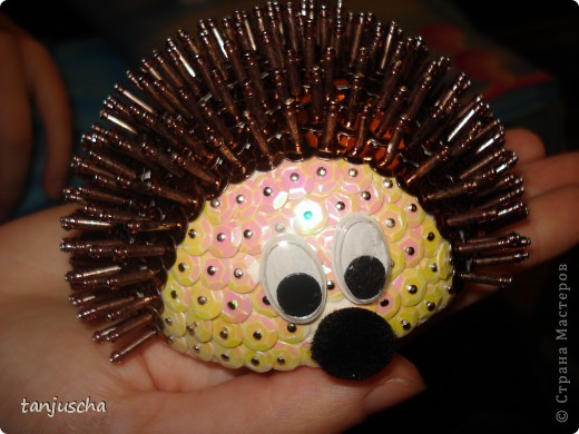 Из половинки пенопластовой заготовки получится не менее симпатичный ежик. Делается он очень быстро и просто. Для работы нам потребуются: булавки-гвоздики, пайетки двух цветов, бусинки и стеклярус. Мордочку ежика выкладываем пайетками. Нанизываем на булавку пайетку и втыкаем внахлест, для того, чтобы не было видно белого цвета шара. Затем делаем иголки ежу – на булавку надеваем маленькую бисеринку, стеклярус и пайетку. И так втыкаем «иголочки» до конца шара. Приклеиваем глазки и носик. Ежик готов!