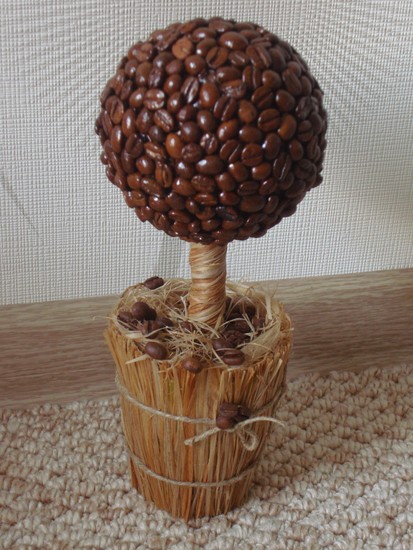 Устанавливаем ствол в горшок. Аккуратно проделываем отверстие в пенопластовой заготовке для ствола дерева. При помощи клея соединяем детали. Украшаем шар любыми подходящими элементами, будь то кофейные зерна, конфеты, искусственные цветы, стеклышки, орехи, шары из войлока, упаковочная бумага, бумажные цветы.