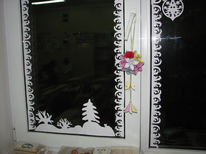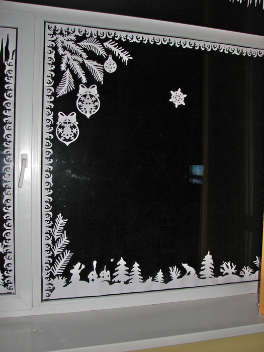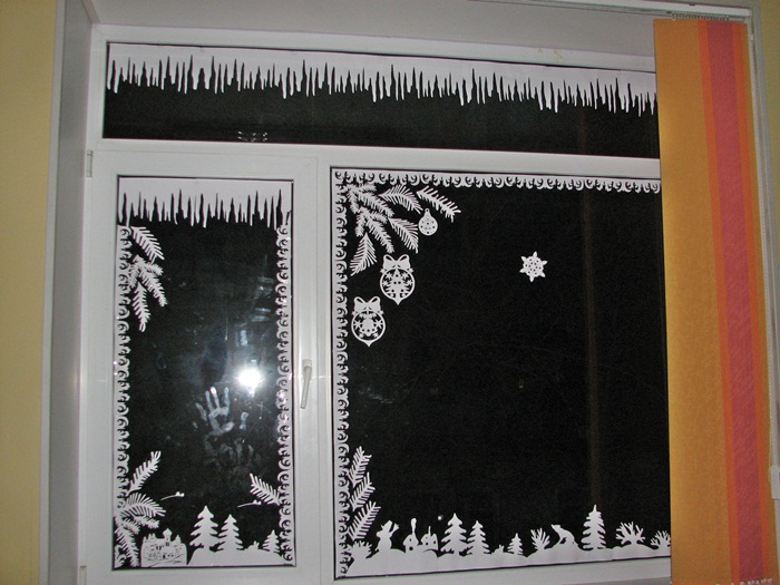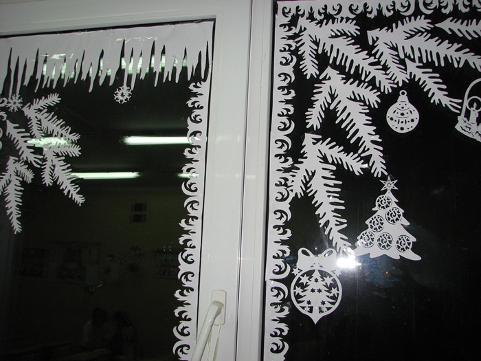 Жаль только, что не настоящаа, а вырезанная из бумаги, да и окно не дома, а в школе, где учится Светланка. Итак, все началось с того, что я вызвалась помочь украсить кабинет к Новому году. Приглянулись вырезалки - киригами, и я решила попробовать, благо схем в Интернете великое множество - только выбирай. Для начала вырезала несколько и понесла показать учительнице вариант декора, а после его одобрения я решила замерить размеры окон... Но отступать было поздно... В итоге получилась большая коробка всевозможных вырезалок, из которых сосульки, сосновые ветки и морозный узорпришлось делать самостоятельно. В итоге получилось вот что: